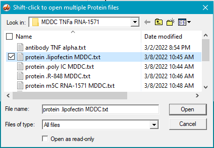 3. Use the Protein button on the silver button bar to open the DC samples folder (mRNA data -> cytokine ELISA -> DC samples).
