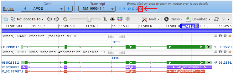 6. Click the back button on your browser to see all four exons, with the marker for rs7412 in the fourth exon. Hover your cursor over the fourth circle without clicking (red box), and the fourth exon will be highlighted. Then click on the fourth circle to show the entire sequence of the fourth exon (second image below).