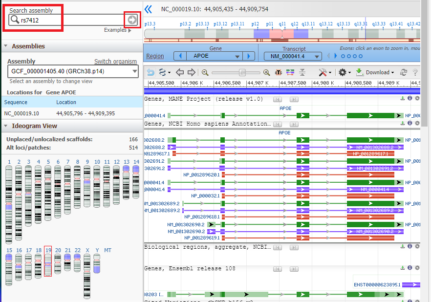 Type or (copy and paste) rs7412 into the Search Assembly box, then click the arrow in that box to search for that SNP. Note that this designation is case sensitive, so the ‘rs‘ should be lowercase.