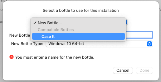 5. Crossover will ask you to create a new bottle name. Name it “Case It”, then click Done.