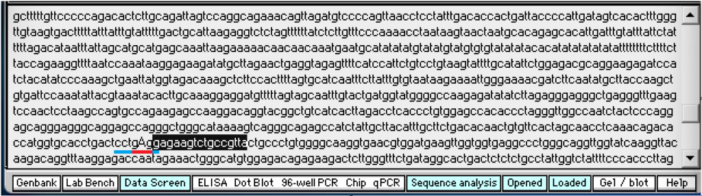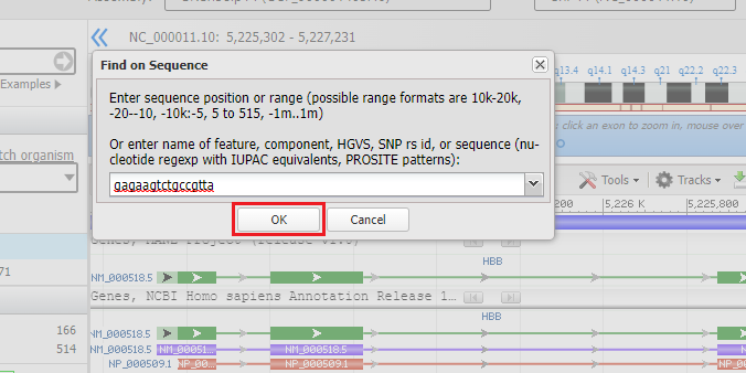 This search sequence will be used because it is located next to the codon that has the sickle-cell mutation (gTg), as shown below (underlined in red – click to enlarge).