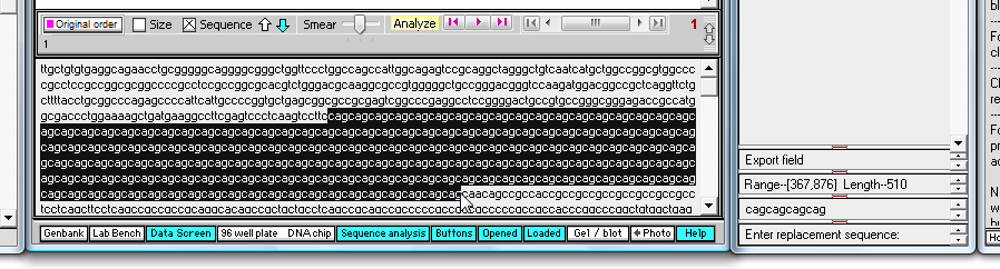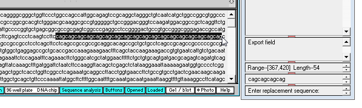 13. By eye, drag with your mouse to highlight the entire series of 'cag' repeats in the mutated sequence, and not that the total length is 510 characters (as shown in the 'Range' field near the bottom of the SA window).