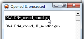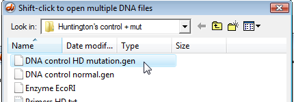 Open the 'DNA control normal.gen' file which is inside the 'Huntington's control + mut' folder.