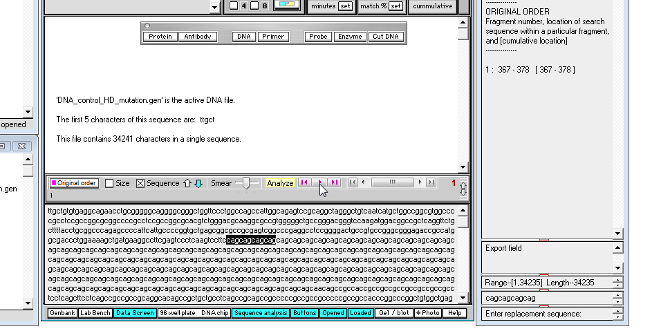 7. To search for the first occurrence of the 'cagcagcagcag' triplet sequence, click the middle purple arrow button on the gray divider bar, and note that the first occurrence is highlighted, and the numerical location appears in the 'Search results' field of the SA window (that is, the first character of 'cagcagcagcag' is at location 367 from the beginning of the sequence, and the last character is at location 378).