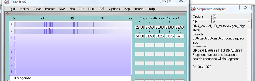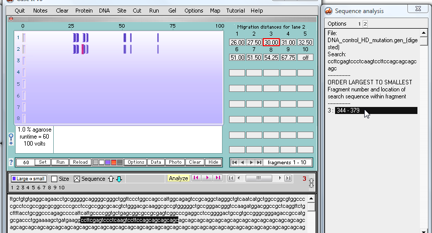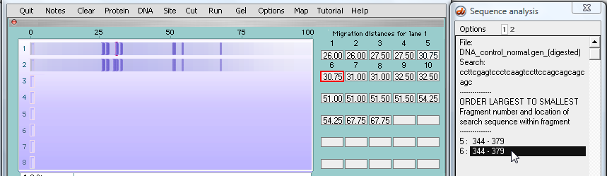 | Note: The normal fragment in the top lane traveled further (30.75) than the fragment from the mutated sequence (30) because the normal fragment has fewer repeats of the 'cage' sequence. |